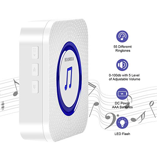 - 銆�55 Klingeltoneinstellungen銆戙��55 Klingelt枚ne und LED licht 銆慏iese drahtlose T眉rklingel verf眉gt 眉ber 55 verschiedene Klingelt枚ne und kann mit einer Lautst盲rke von 0dB bis 100dB (5 Stufen) eingestellt werden, neben den Melodien erscheint zudem ein visuelles Signal, blinkt ein blauer LED Kreis, wenn jemand besucht. k枚nnen Sie jeden Empf盲nger auf jedem Stockwerk und setzen Sie die Druckkn枚pfe an Ihrer Haust眉r und Hintert眉r.Es macht Sie, kein Besucher zu verpassen.