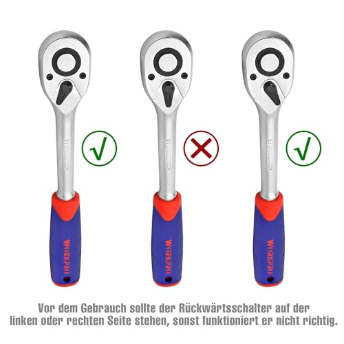 - PRAKTISCH: Ratschen mit Einsatz-Schnelllöser für schnellen Ein- und Aushängen. Umschaltknarre mit 72 Feinverzahnte ermöglichen präzise Arbeit. Der weiche ergonomische Griff verbessert den Arbeitskomfort.